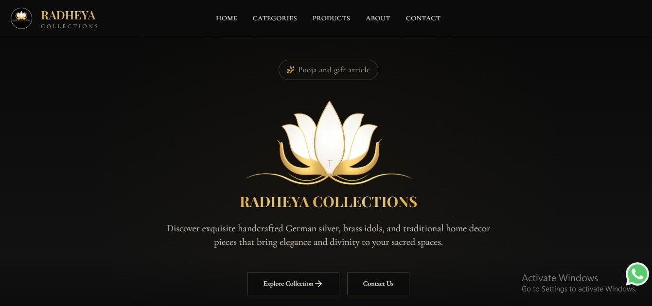 A premium e-commerce style website for showcasing handcrafted German silver items, brass idols, pooja essentials, return gifts, and traditional home décor with WhatsApp-based ordering.